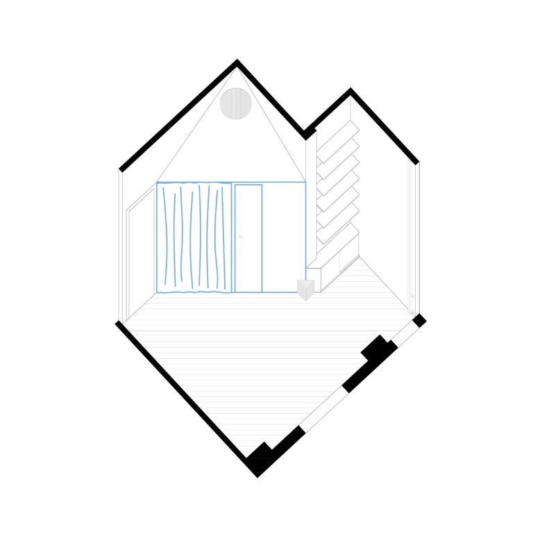 Drawings are guided by strong geometrical shapes, looking for the beauty of plan. Details follow the same idea. A circular hole is created in the bathroom roof to bring natural light. The mosaic triangle in the space hides some pipes and serves as a little platform for sculptures or plants. It’s important that every choice in the project is motivated by at least two reasons, that one object is used for different functions. In the bathroom, the round mirror and spherical lamp are geometrical forms to blur their technical role.