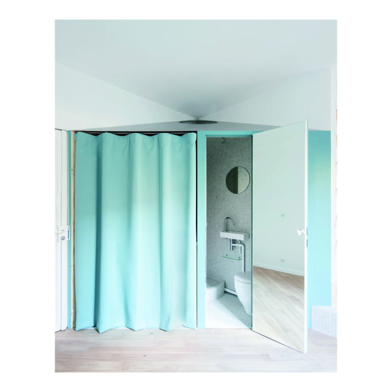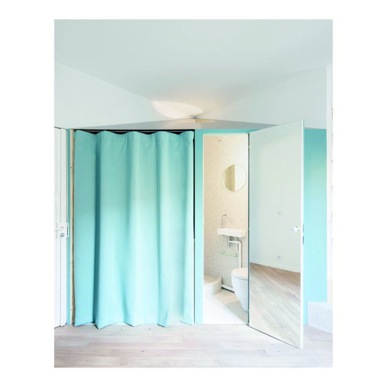The door of the bathroom has a hidden frame and is painted with the same color of the wall to disappear. The proportion of the door, 50cm wide, makes it higher. The orientation of the parquet follows the biggest diagonal of the space. It makes it feel bigger. Its reflection in the mirror creates the illusion of another room. The use of a little square mosaic in the bathroom aims to multiply the joints to increase the feeling of space.