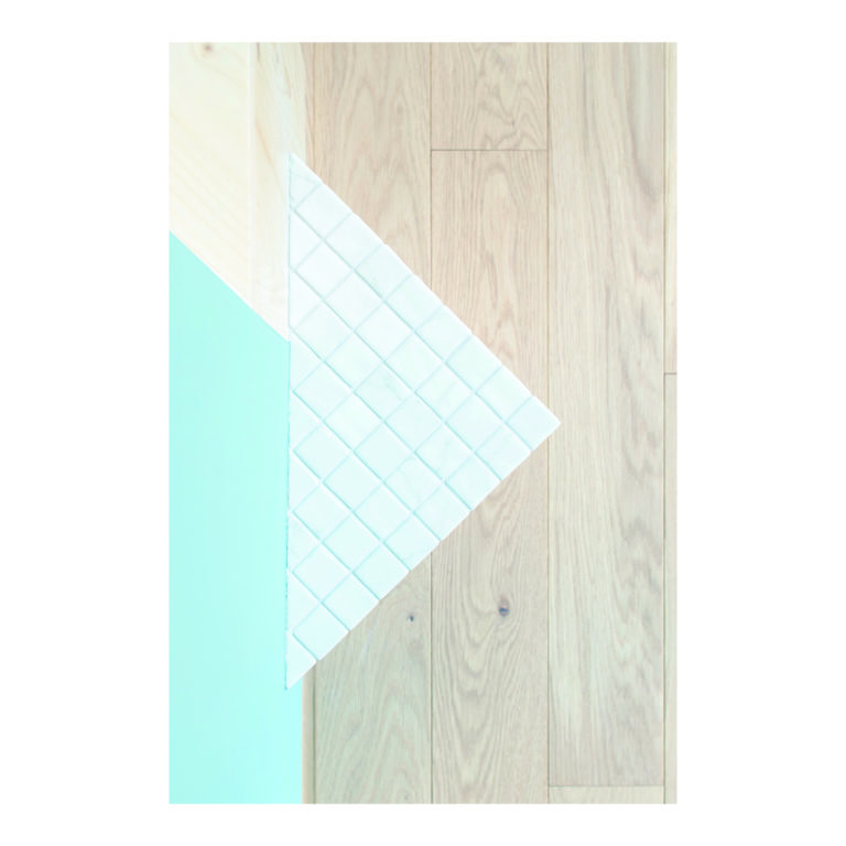 La porte de la salle de bain possède un cadre dissimulé et est peinte de la même couleur que le mur, ce qui la fait disparaître. Sa proportion — 50 cm de large — accentue l’impression de hauteur. L’orientation du parquet suit la plus grande diagonale de l’espace, ce qui renforce la sensation d’ampleur. Son reflet dans le miroir crée l’illusion d’une autre pièce. L’utilisation d’une petite mosaïque carrée dans la salle de bain permet de multiplier les joints et d’accentuer la sensation d’espace.