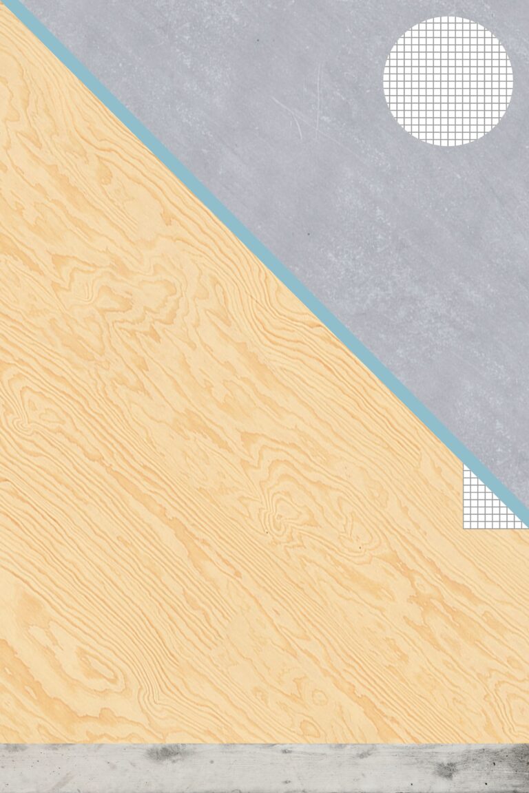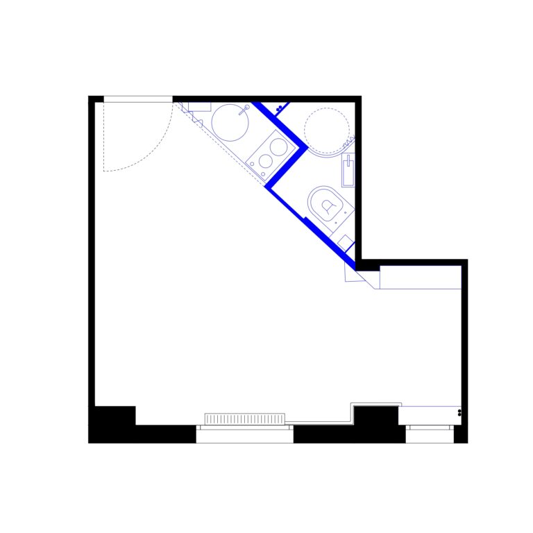 Pillars and beams in the facade are scrubbed to reveal raw concrete. The roof of the bathroom is a thin sheet of metal. All the kitchen is made of the same material, pine plywood to unify the functions. A blue curtain hides the kitchen and creates an abstract blue wall. The pipes of the radiator are left visible and integrated in the shelf.