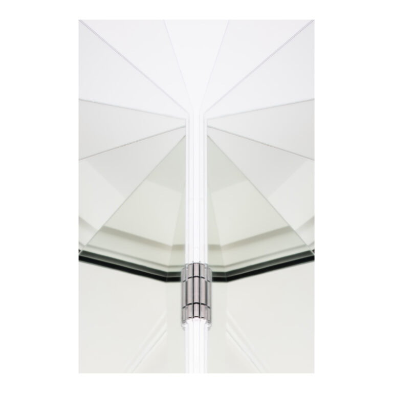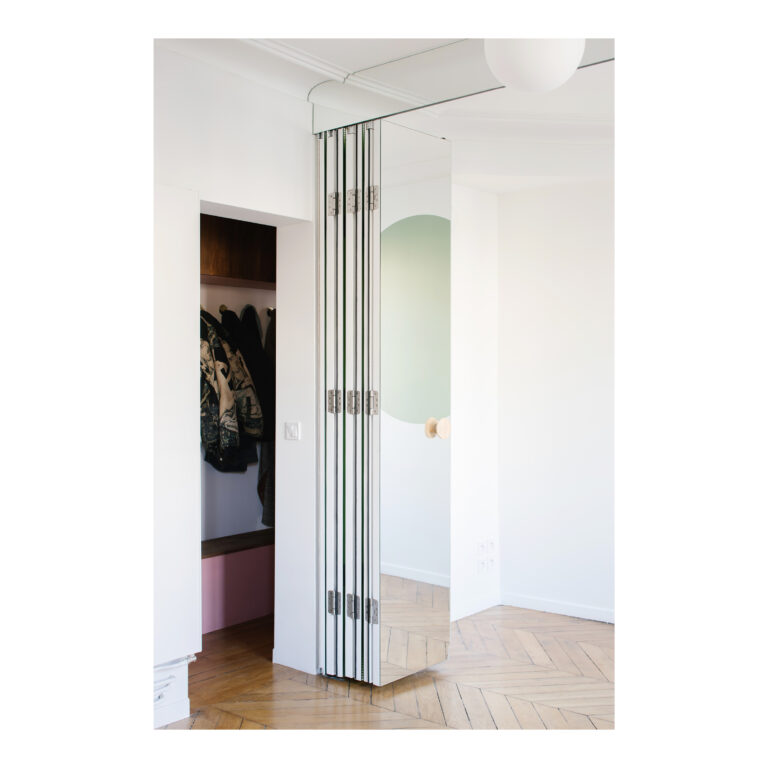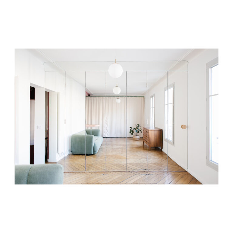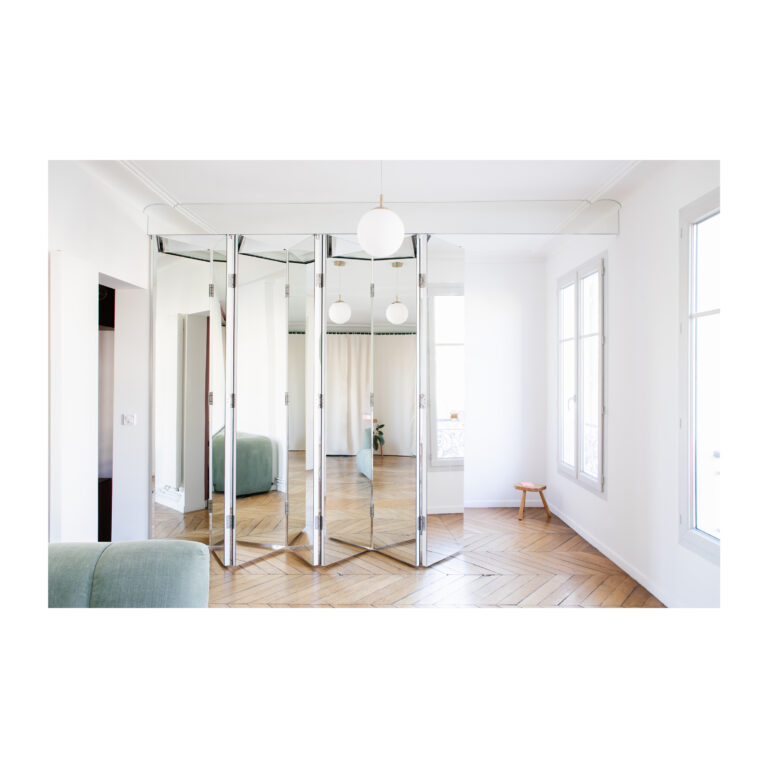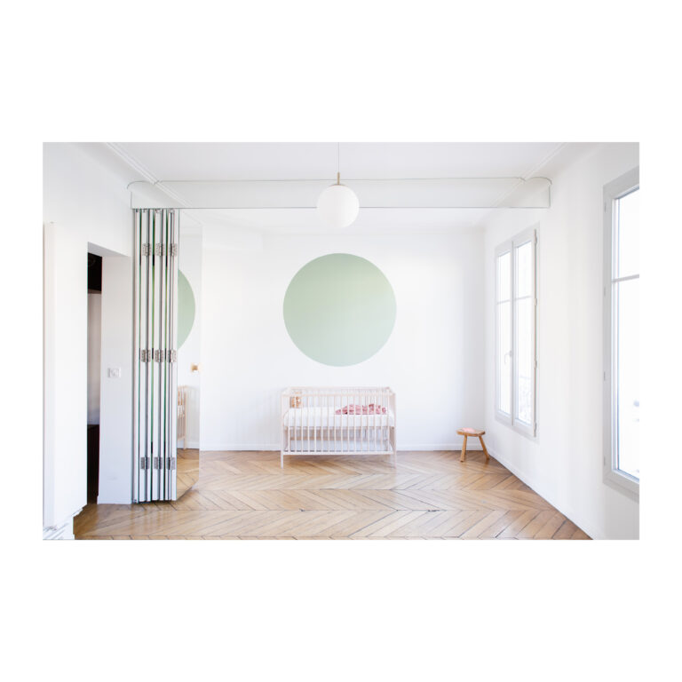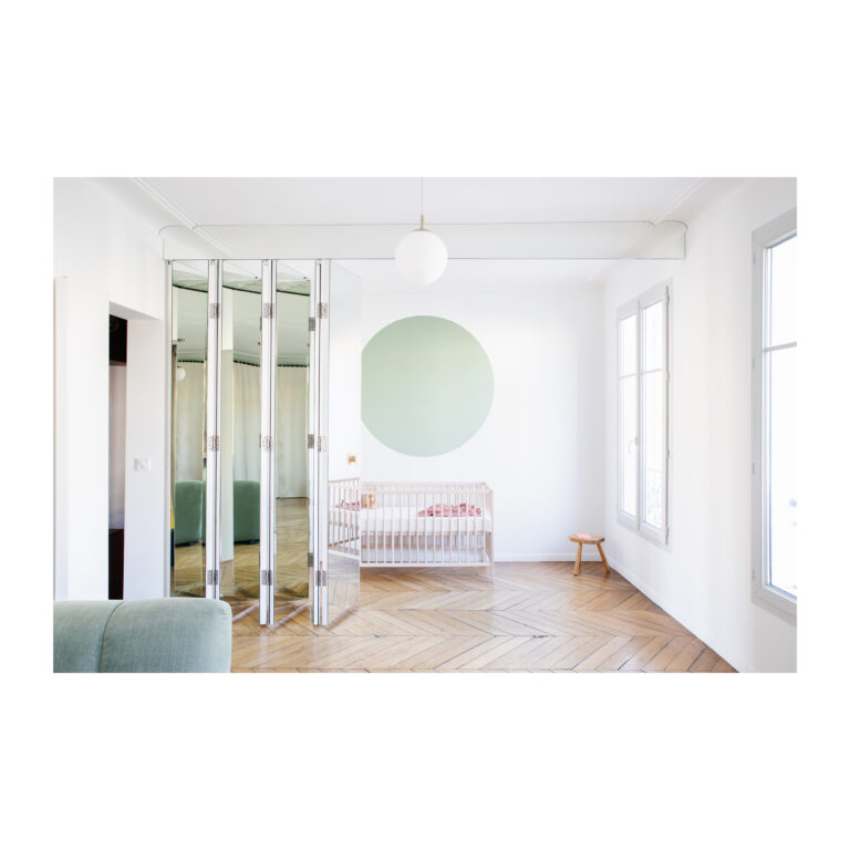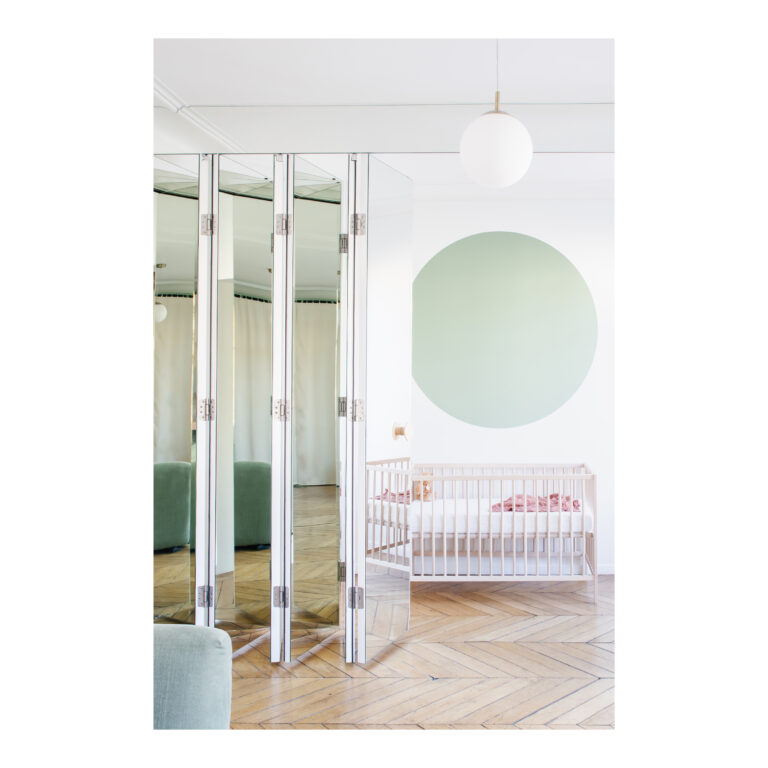 D’un côté, une petite pièce est récupérée sur le salon pour la chambre bébé. Séparée du salon par une paroi pliable, l’espace est alors adaptable aux besoins, ouvert quand le bébé est réveillé, ou quand il a besoin d’espace pour jouer, fermé quand il dort. Recouverte de miroir, cette paroi disparaît en agrandissant l’espace et crée de nouvelles perspectives.