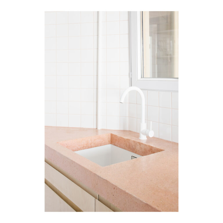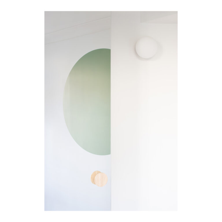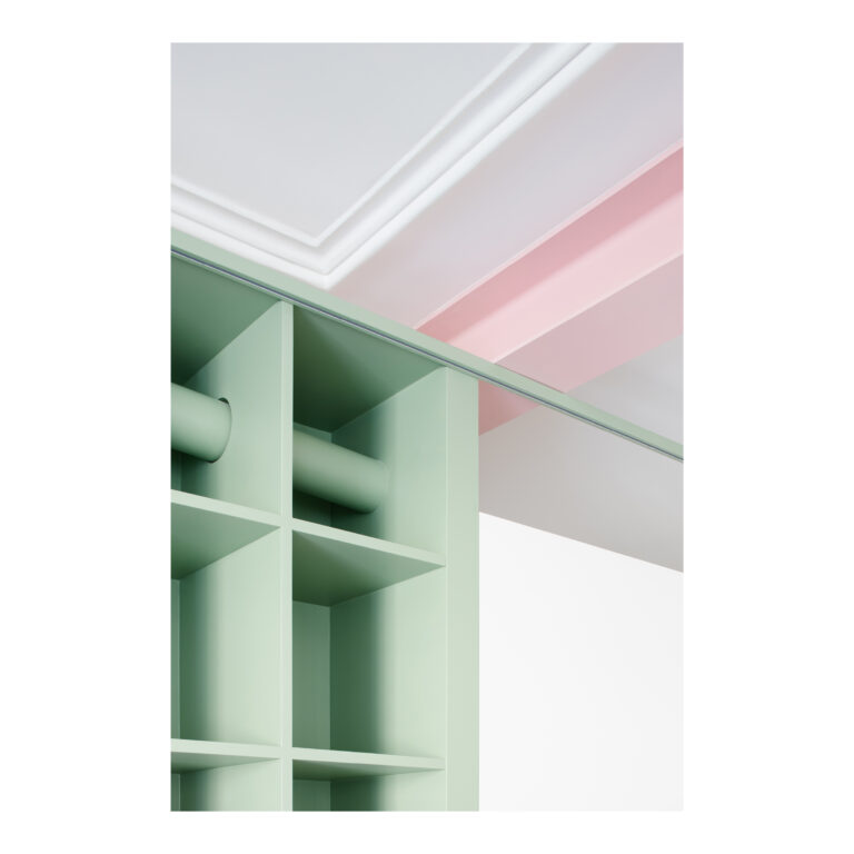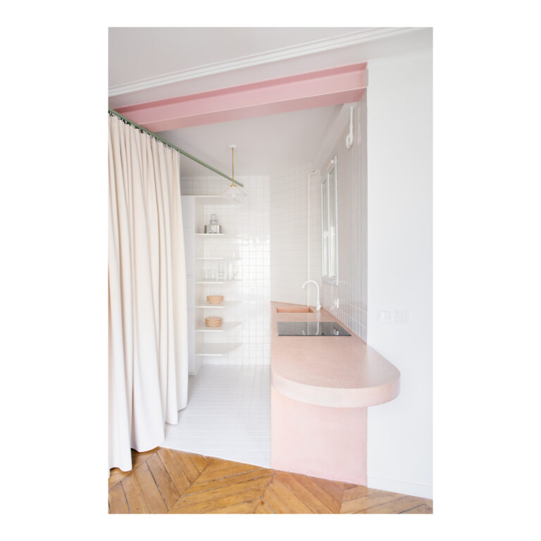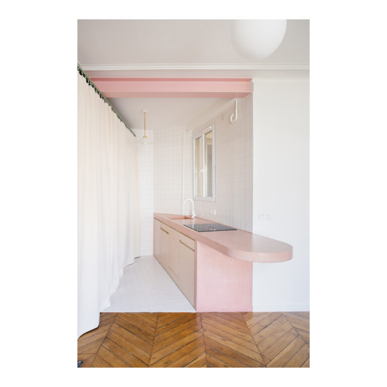 La couleur, que ce soit dans la cuisine ou dans la chambre, définit les espaces, et donne à lire les différents éléments du projet, qu’ils soient structurels, fonctionnels, ou purement ornementaux.